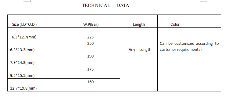 Product function: high pressure resistance, good pulse capability, low fluid resistance, small bending radius (has a good bending performance , not easy to break for us when we operate ) high abrade resistance, high cleanliness , low expansion, highly resistance to aging and low temperature, excellent resistance to cold medium, good resistance for oil and alkali